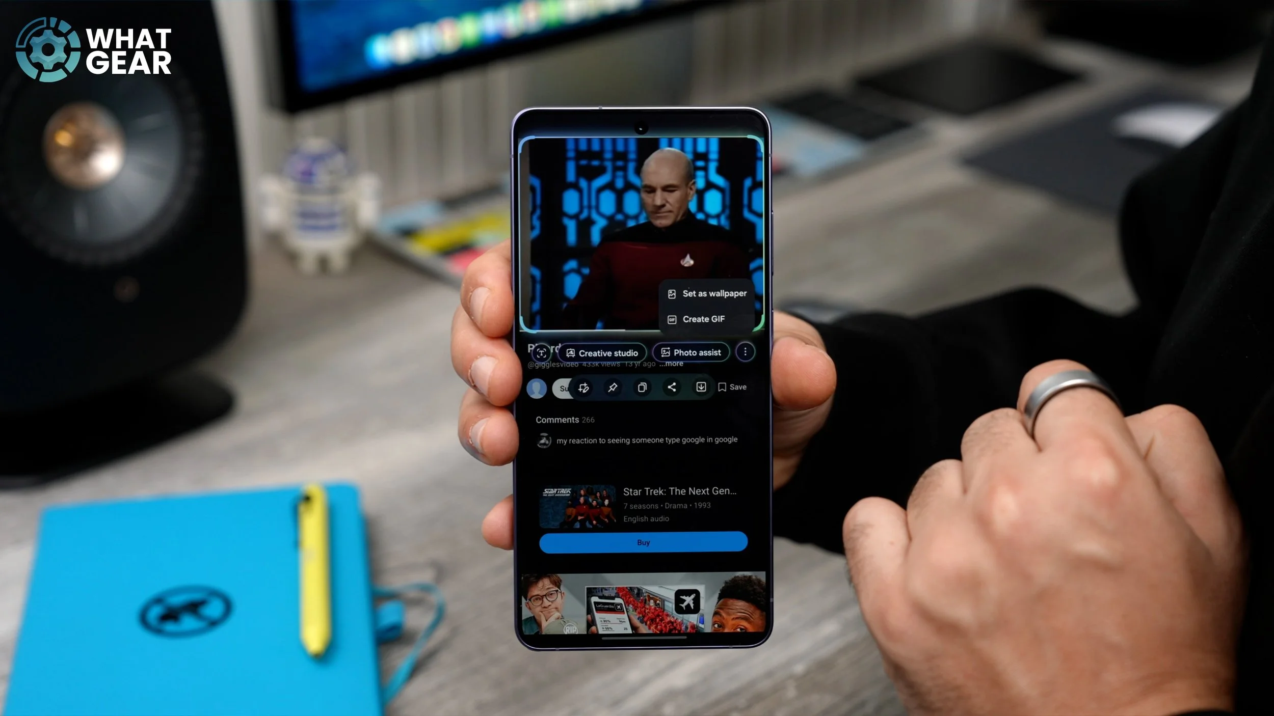 One of the most powerful, hidden, exclusive Samsung tools that not that many people know about is this. When you swipe out the sidebar, right at the top here is Samsung’s AI Select. So this is kind of a more advanced version of the Circle to Search tool, because it doesn’t just search for things — it can actually extract information and even create content. So let me show you how you can use it to create your own GIFs. So right here on YouTube, I’ve loaded up the classic Picard facepalm scene, and what I recommend you do is, when you load up a video you want to create a meme from, hit the little settings in the top right corner,go to More, and put it into loop. That way, the video keeps looping round and around. Now, once you’ve done that, here’s a little trick to access the AI Select tool much more quickly. See the sidebar? Instead of dragging it out and then tapping AI Select, what you can do is hold your finger down on the sidebar, and that automatically opens AI Select. If you tap the area that you want to capture, it will expand to that area.