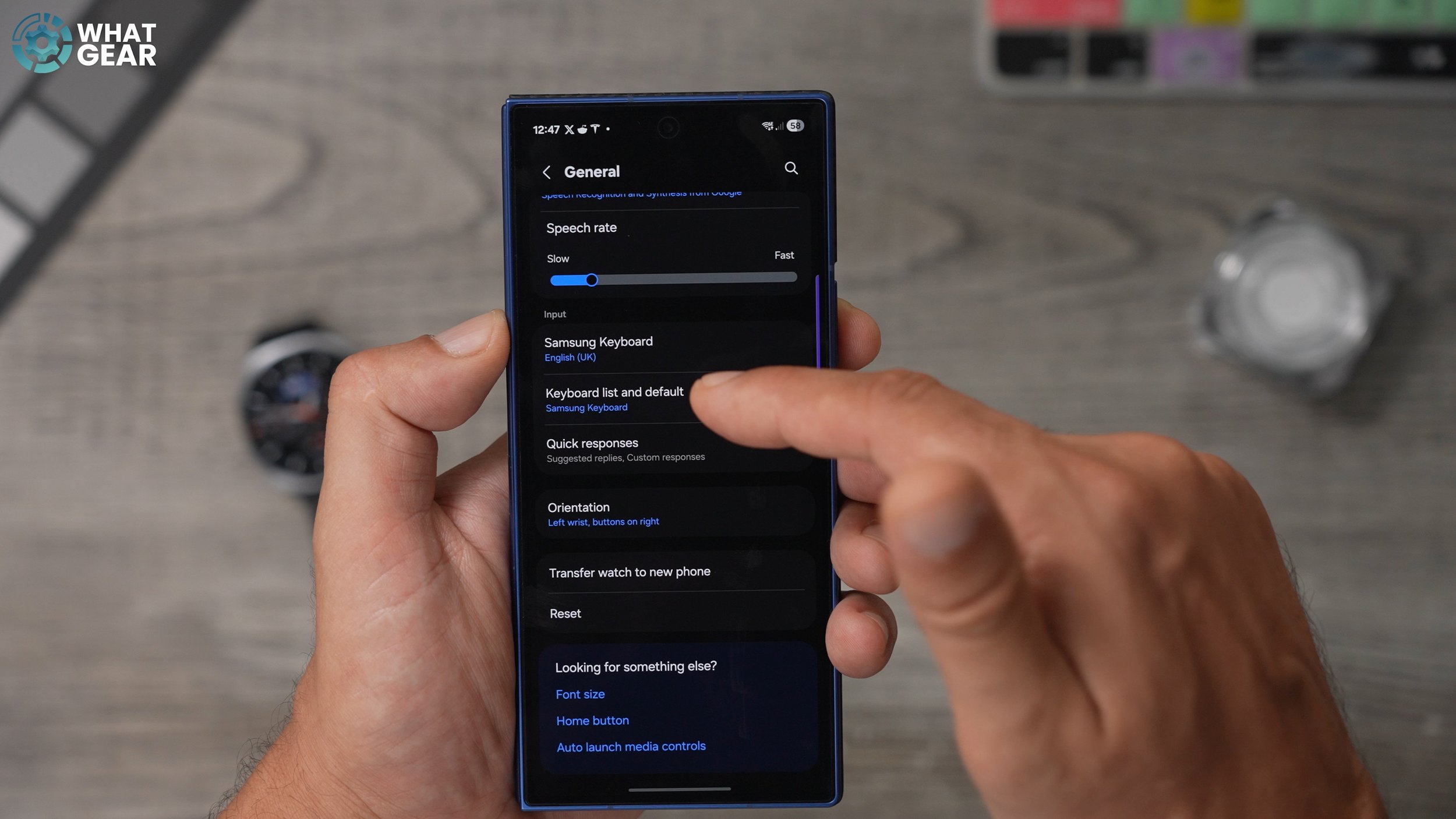 So once you've successfully installed the keyboard on the watch, what you need to do now is go into the Galaxy where app, go to the watch settings, scroll all the way down to general, and then here you should see the Samsung keyboard set up, but you want to go to the keyboard list and default. And at the top the default keyboard. You want to change this to Gboard. Okay, so now you've got Google's keyboard set up slightly different from Samsung's One, and it does support Swype typing. And you can just hold your finger down on a letter, swipe to another letter, or the rest of the word to spell things out quickly in one motion.