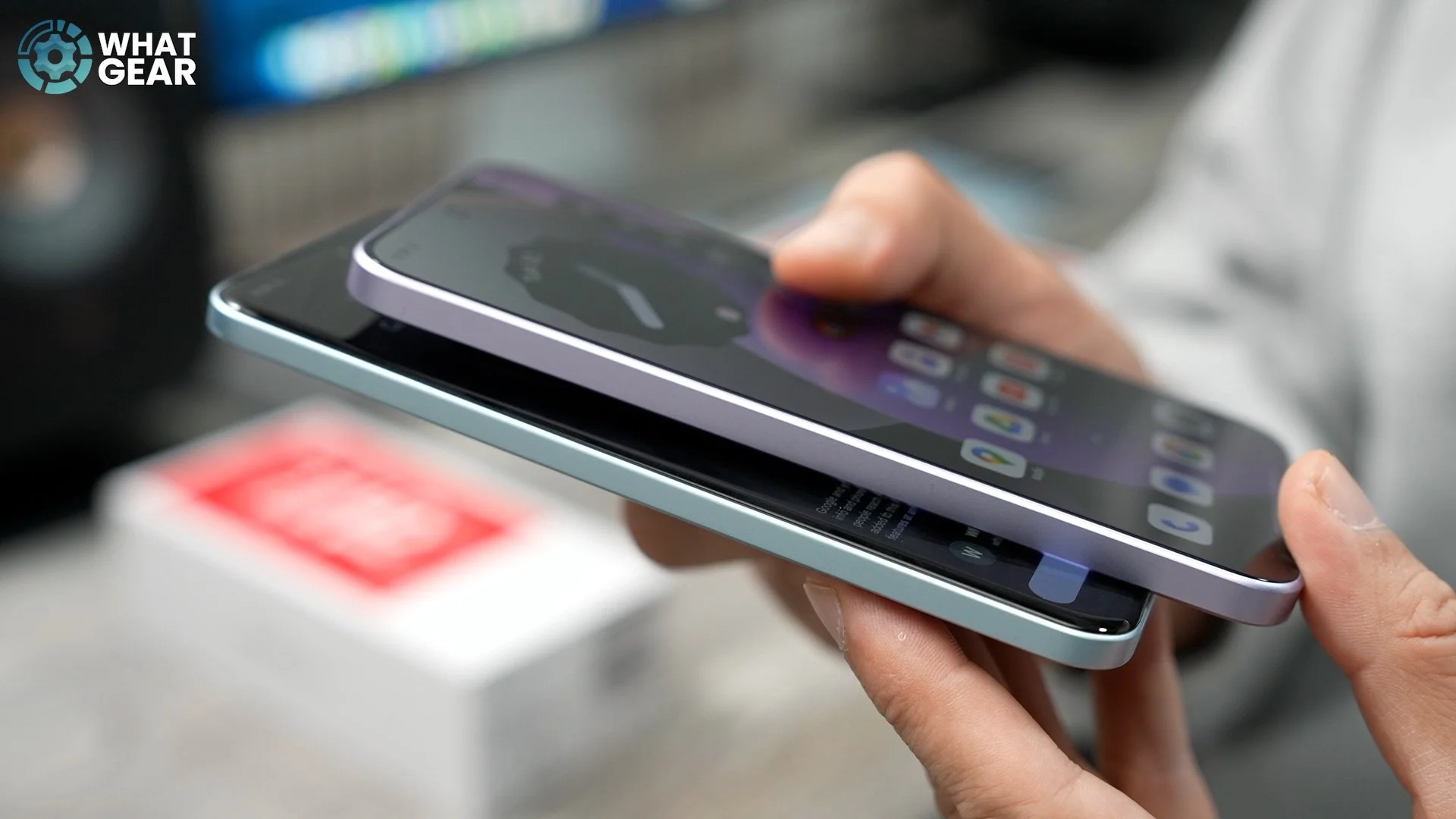 Something that I noticed just looking at these right now is that the bezels appear to be thicker on the Pro+. Maybe that’s because of that curvature – I’m not sure. Anyway, something else you need to know about these two displays is that they are actually, apart from the glass, identical. They’re both 6.83-inch CrystalRes panel displays. They both have a 1.5K resolution (2772 × 1280), refresh rates up to 120 Hz, and peak brightness up to 3200 nits, which is very impressive for phones in this price category. And they are 12-bit panels, and side by side, just going off what I can see with my own eyes, they look pretty much identical – except for that little bit of curvature at the side of the frame on the Pro+, which does introduce some more reflections, which again could be a little bit of a win for the Pro.