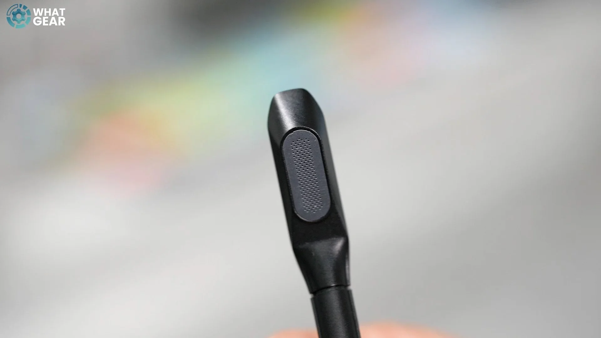 Now, the microphone here might look like just a regular headphone mic, but there are a couple of interesting features. First of all, it does support flip-to-mute, so when you raise it up like this, it actually switches the microphone off, and when you bring it back down, it switches it back on. Secondly, they say that this is actually a broadcast-grade microphone, and the frequency range on this is 50Hz to 15kHz. This is perfect for clear voice capture. It does use a cardioid pickup pattern, of course, for optimal noise rejection, and there’s a little built-in pop filter.
