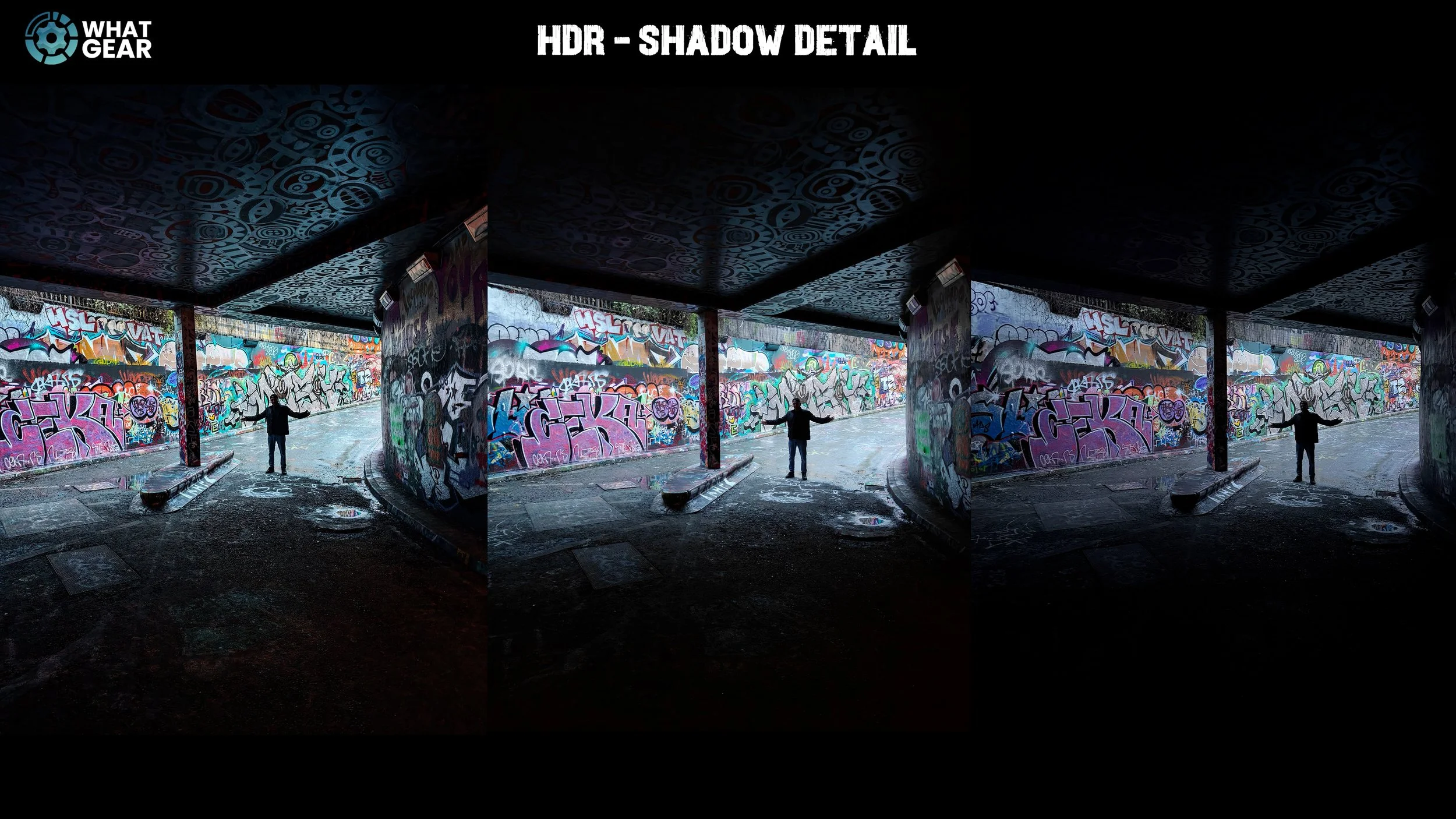 So this one is a fantastic test of the three phones' HDR abilities. It's also a great test for the sensitivity and the quality of those primary sensors. And I'm going to draw your eyes to a few things to consider. Look at the shadow detail on the ceiling — there's a big difference there. Also, look at the details on the tarmac. You can see the points at which the details start to fade and disappear altogether into the darkness. And the reality is, there are a number of reasons why this could happen. It could be less light intake through the lenses, a less sensitive sensor, or it could actually be a creative choice by the brands to crush the shadow details and create this more contrasty look.