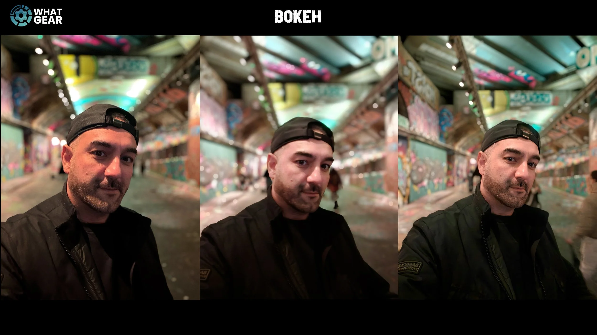 So now I am at Leake Street, the famous graffiti tunnel started by Banksy. So I kind of figured, let's take some graffiti-centred shots from here, because it takes a lower light source around here. Let me know how the three cameras are performing against each other. And again, you get to have a look yourself. Here is a portrait shot. This is where the phones add this kind of blurry background effect to the image using post-processing. And this really is an interesting balancing act for the phones.
