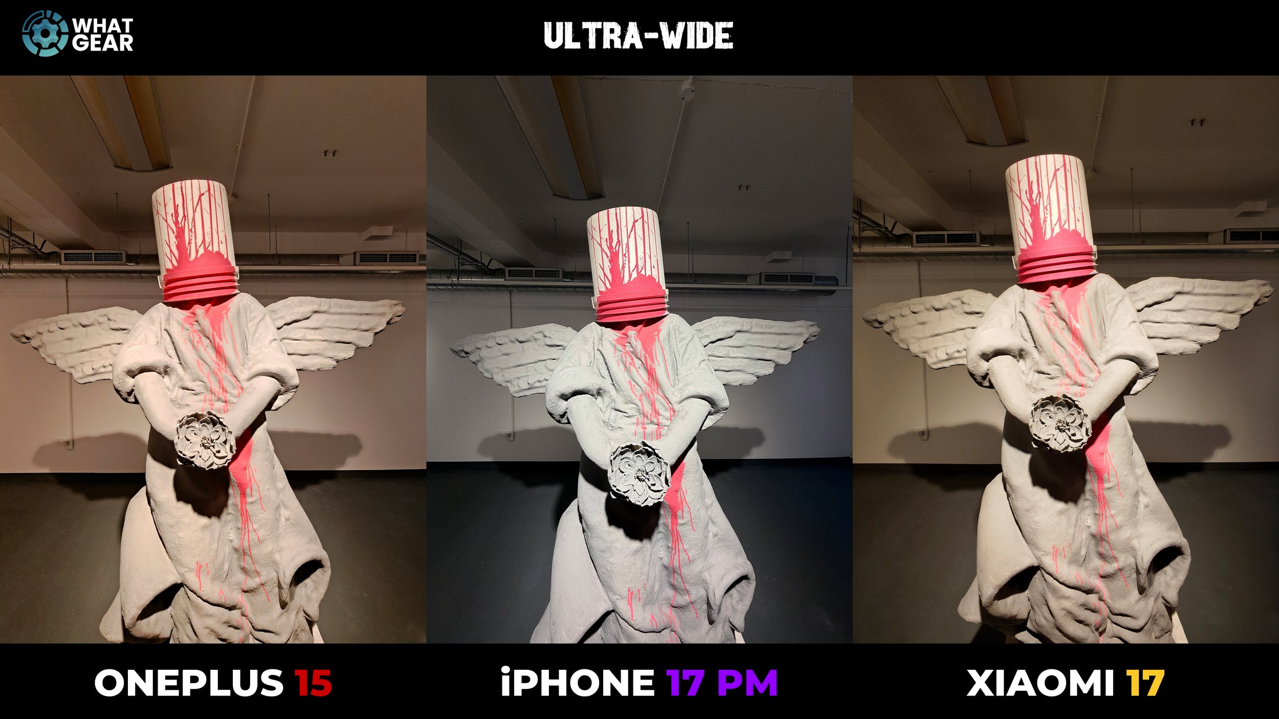Welcome to another whatGear blind camera comparison. In this one, I'm testing the brand new Xiaomi 17 against the iPhone 17 Pro Max, and I've thrown in the OnePlus 15 for good measure. And if it's your first time here, here's how this works. I'm going to show you three photos. Take a look at them closely and choose which one you think instantly looks the best. And you see this timer up top. When that timer runs out, the phones that took the photos will be revealed. That way, you can come to your own unbiased conclusion about which phone is taking the best photos and videos. Now, before you ask, why didn't I test the Xiaomi 17 Ultra? Well, unfortunately, Xiaomi didn't send it to me. Maybe they didn't think I was going to make a video like this, but either way, let's see how it holds up against these top-tier flagships. Let's kick this off with the ultra wide. You should know that all phones were shooting in auto mode. So the white balance is very different on all three of these images. If my memory serves me correctly, there were some warm lights in the environment around this statue.